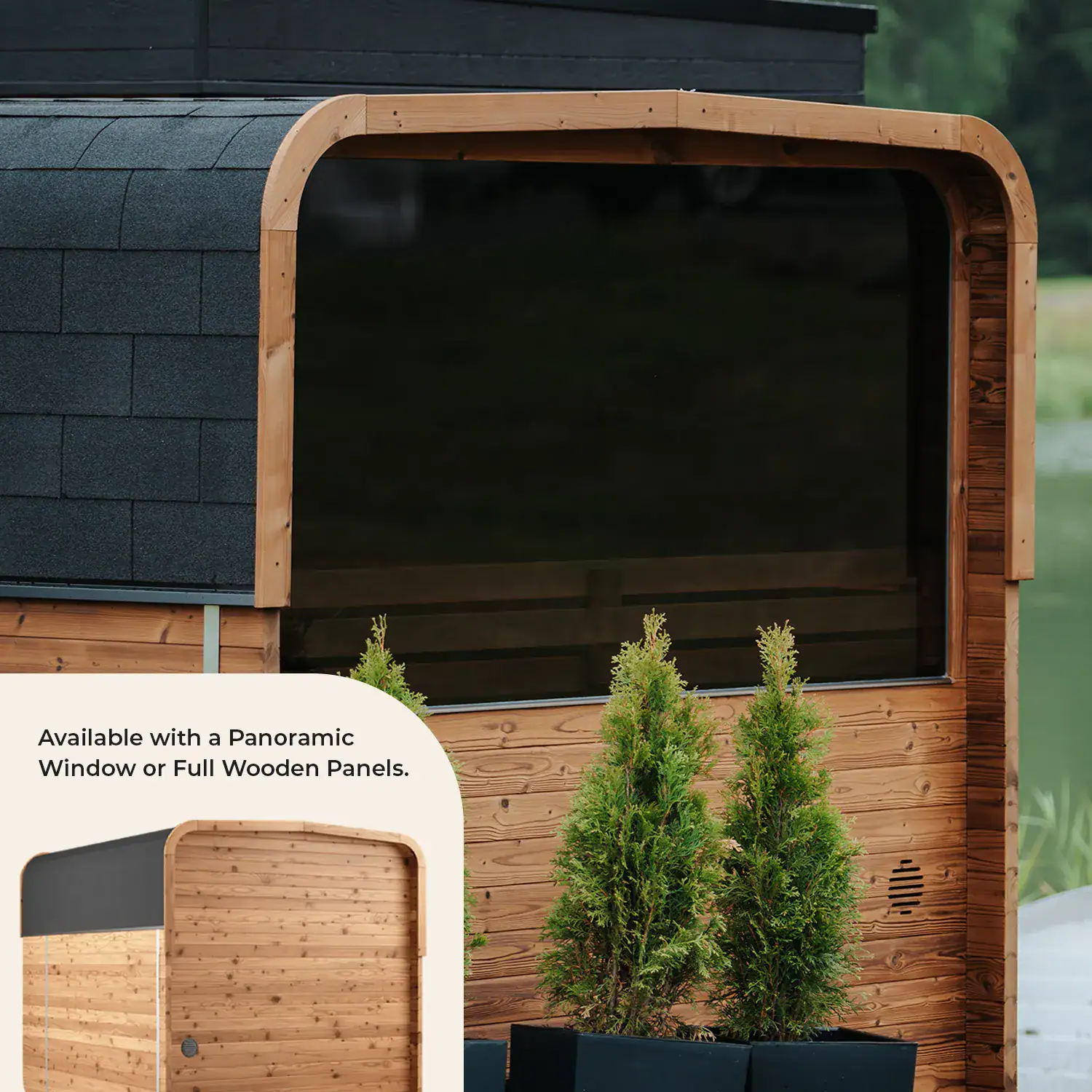 Fusing modern sophistication with classic design principles, the ‘Nora 250’ immediately captivates with its square silhouette and gently curved contours. A panoramic window, along with generous interior space, durability and comfort, makes this outdoor sauna an absolute must-have. Pair with your choice of premium electric or wood-fired heater.